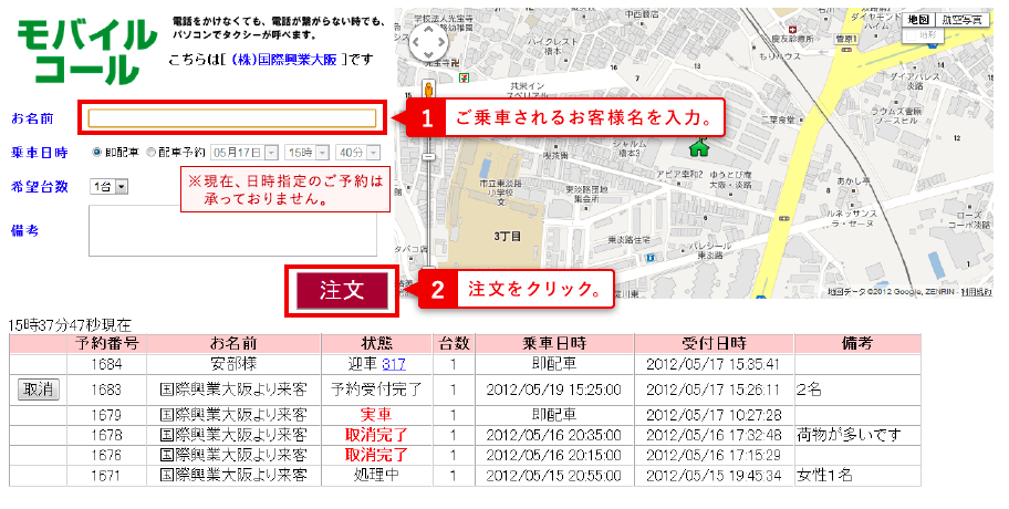 すぐにタクシーを呼びたい時。(お客様名入力して、注文ボタンを押すだけ。)